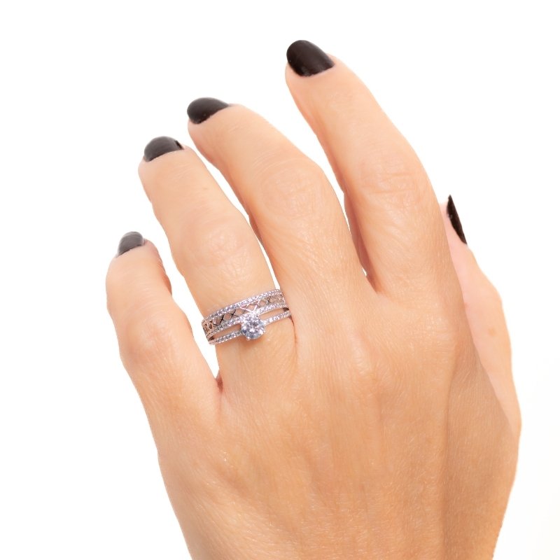 Anel 2 Em 1 Com Zircônias Prata 925 Com Banho De Rodio-sr