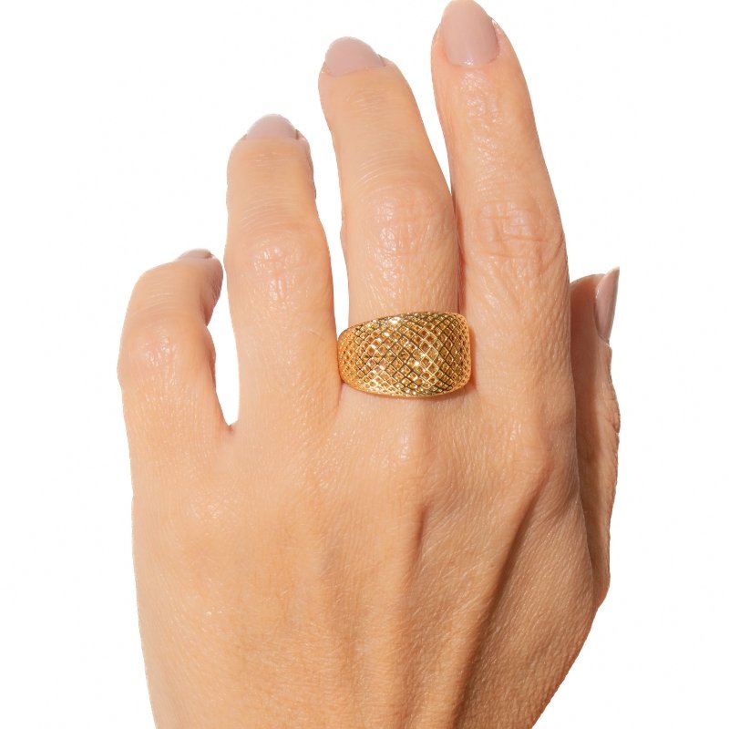 Anel Abaulado 15mm Vazado, imponência e estilo em um design moderno e marcante.Brincos e piercing fake: 5 milésimos de Ouro 18k.