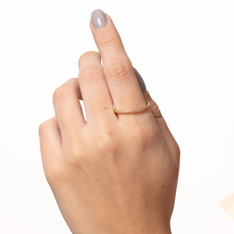 Anel aparador com zircônias, delicado e sofisticado, ideal para complementar qualquer look com brilho e elegância.Brincos e piercing fake: 5 milésimos de Ouro 18k.