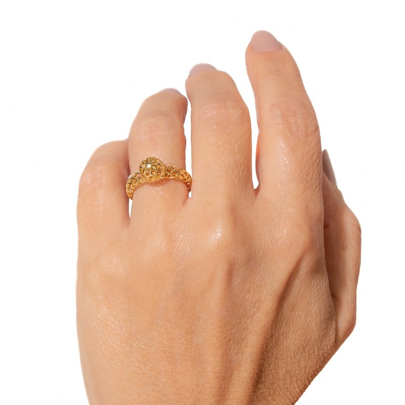 Anel Bola Vazado com design moderno e acabamento sofisticado, ideal para compor mix de anéis com elegância.Brincos e piercing fake: 5 milésimos de Ouro 18k.