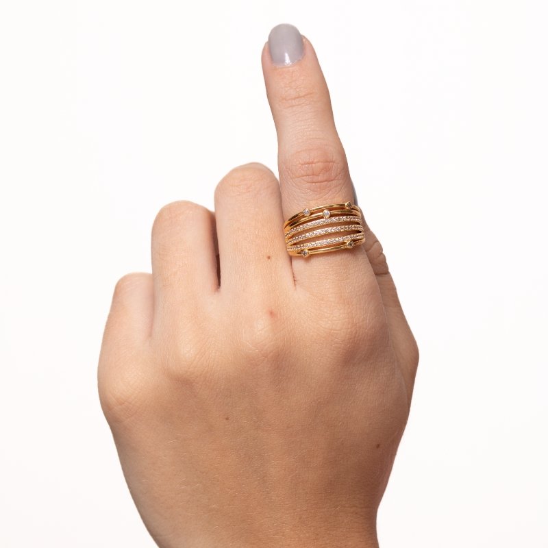 Anel com 6 Fileiras de Zircônia: luxo e sofisticação em um design deslumbrante!Brincos e piercing fake: 5 milésimos de Ou Brincos Ouro 18k.