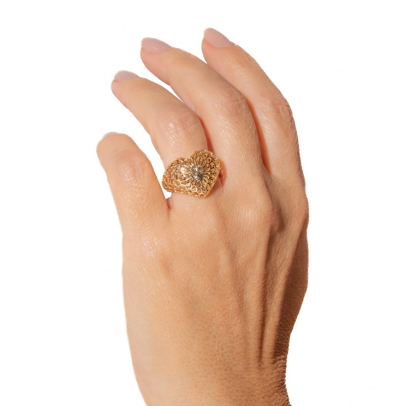 Anel coração abaulado vazado com design delicado e moderno, ideal para compor mix romântico.Brincos e piercing fake: 5 milésimos de Ouro 18k.