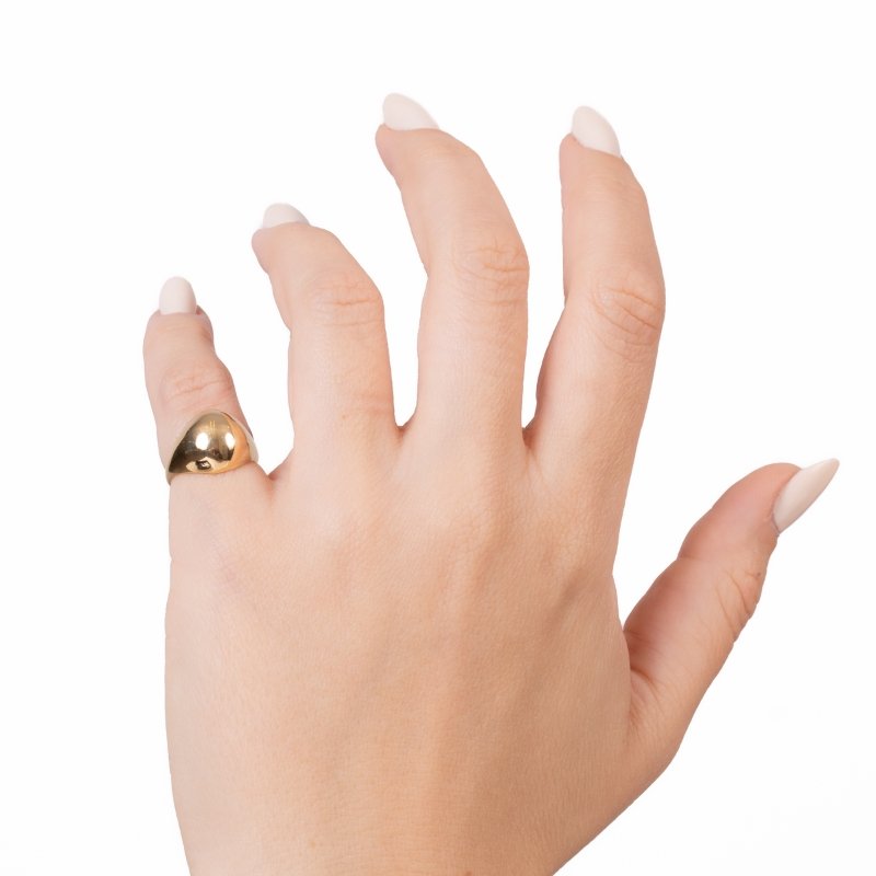 Anel dedinho abaulado liso, design clean e atemporal que combina com qualquer estilo.Brincos e piercing fake: 5 milésimos de Ouro 18k.