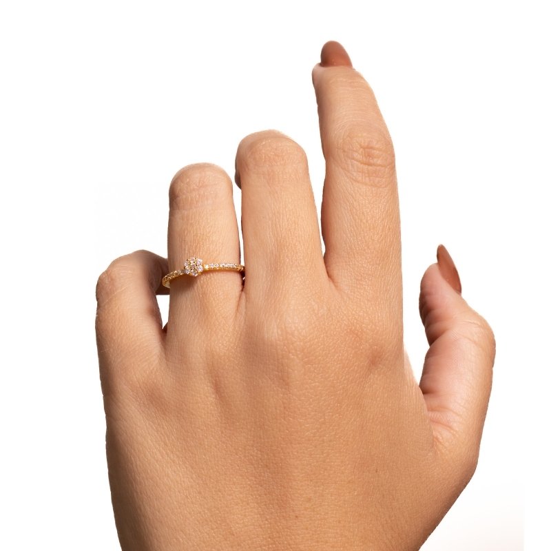 \"Anel solitário flor de 5mm, cravejado com zircônias, trazendo charme e delicadeza ao seu visual.\"Brincos e piercing fake: 5 milésimos de Ouro 18k.