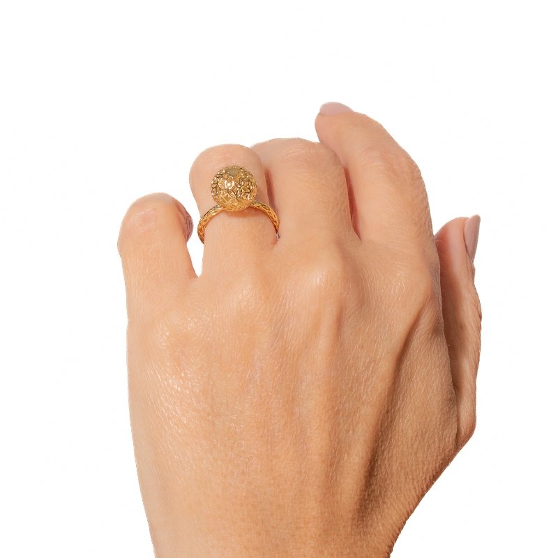 Anel Solitário Bola Vazado, estilo minimalista com toque moderno para composições elegantes.Brincos e piercing fake: 5 milésimos de Ouro 18k.