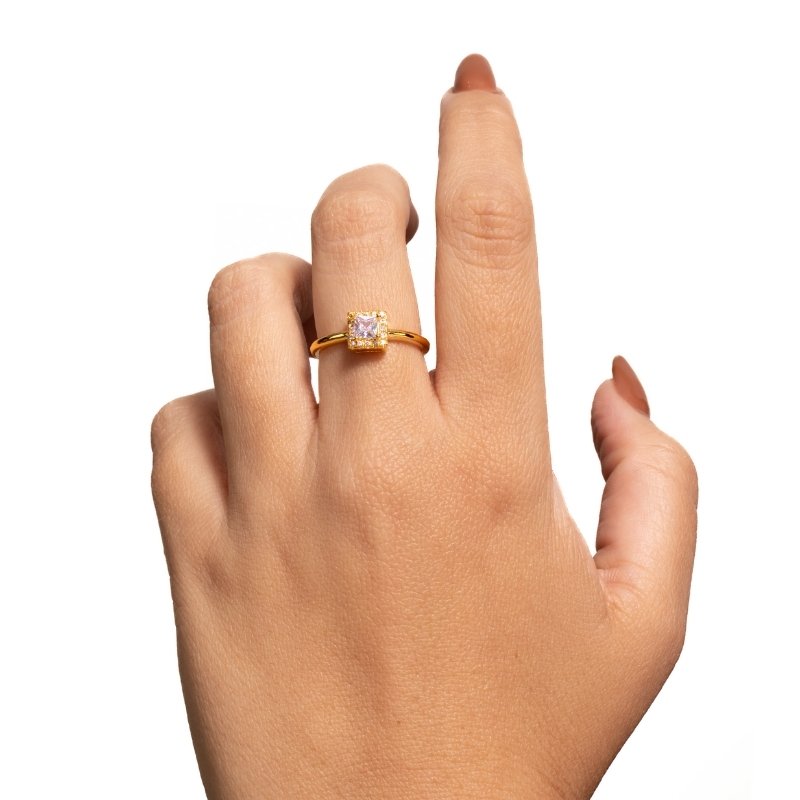 \"Anel solitário quadrado de 7mm com zircônias, trazendo elegância e modernidade ao seu look.\"Brincos e piercing fake: 5 milésimos de Ouro 18k.