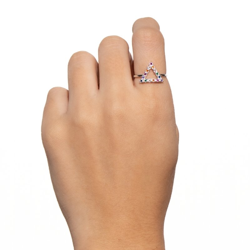 Anel Triângulo com Zircônias Coloridas em Prata 925, design moderno com toque de cor e sofisticação.Peças em PRATA 925.