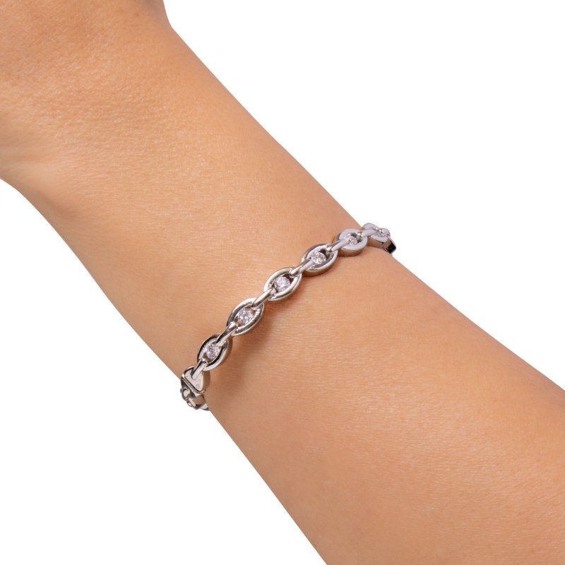 Bracelete de elos ovais com zircônias, leve e elegante, ideal para compor looks com brilho sutil.Brincos e piercing fake: 5 milésimos de Ouro 18k.