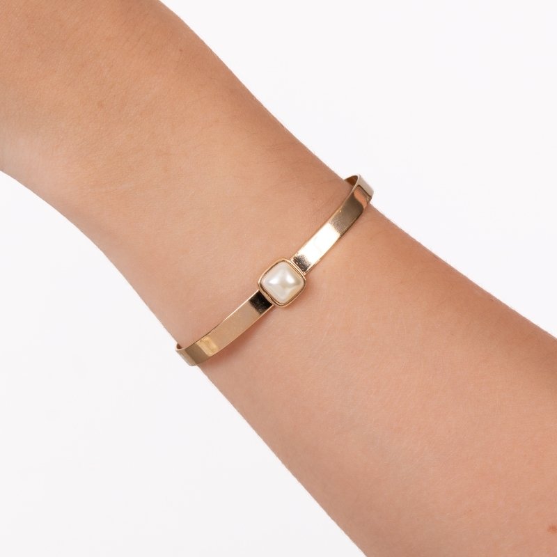 Bracelete com pingente quadrado e pérola, toque sofisticado para composições elegantes.Brincos e piercing fake: 5 milésimos de Ouro 18k.