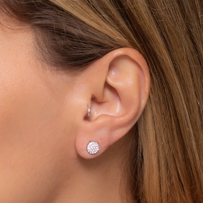\"Brinco redondo cravejado de 6mm em prata 925 com banho de rodio, clássico e sofisticado, perfeito para complementar qualquer look. Ideal para revenda no atacado, com excelente qualidade e design único.\"Garantia VITALÍCIA referente ao teor de prata original.