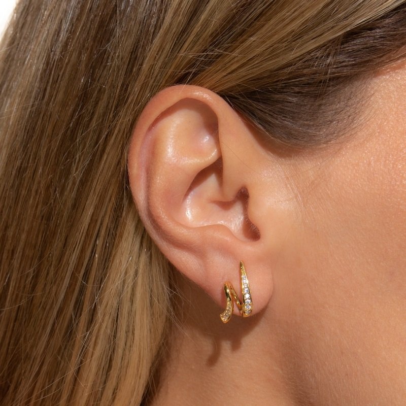 Brinco uma volta com zircônia, elegante e moderno, perfeito para adicionar brilho e sofisticação ao visual.Brincos e piercing fake: 5 milésimos de Ouro 18k.