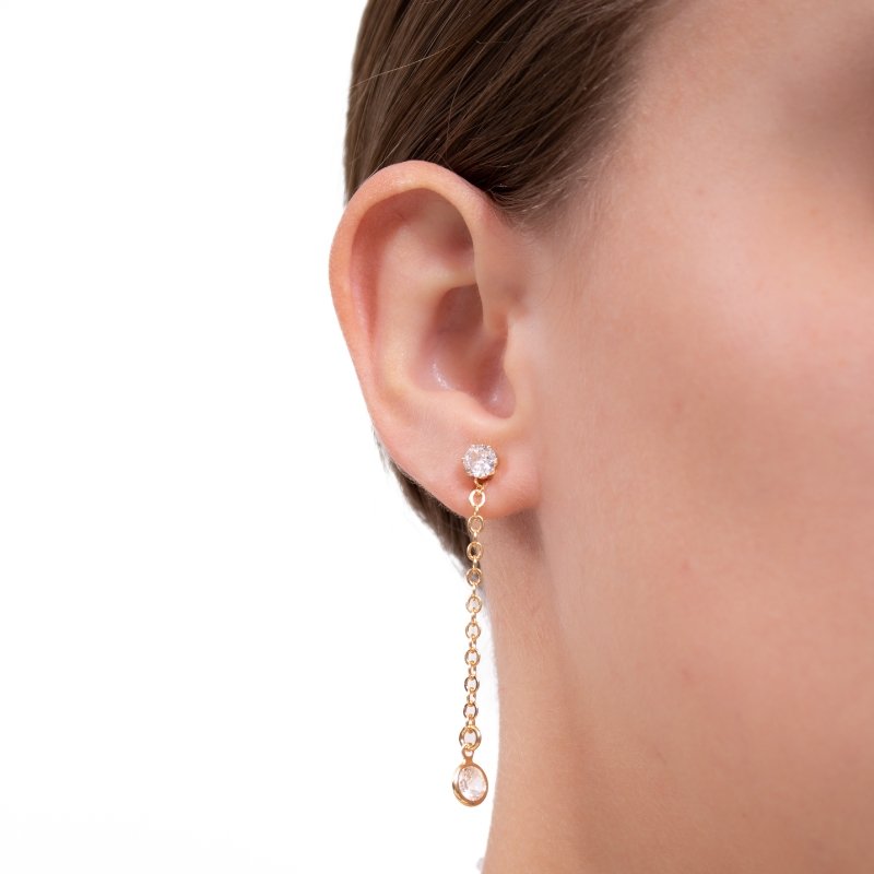 Brinco 2 em 1 com Zircônias 6mm, versatilidade e brilho em uma única peça.Brincos e piercing fake: 5 milésimos de Ouro 18k.
