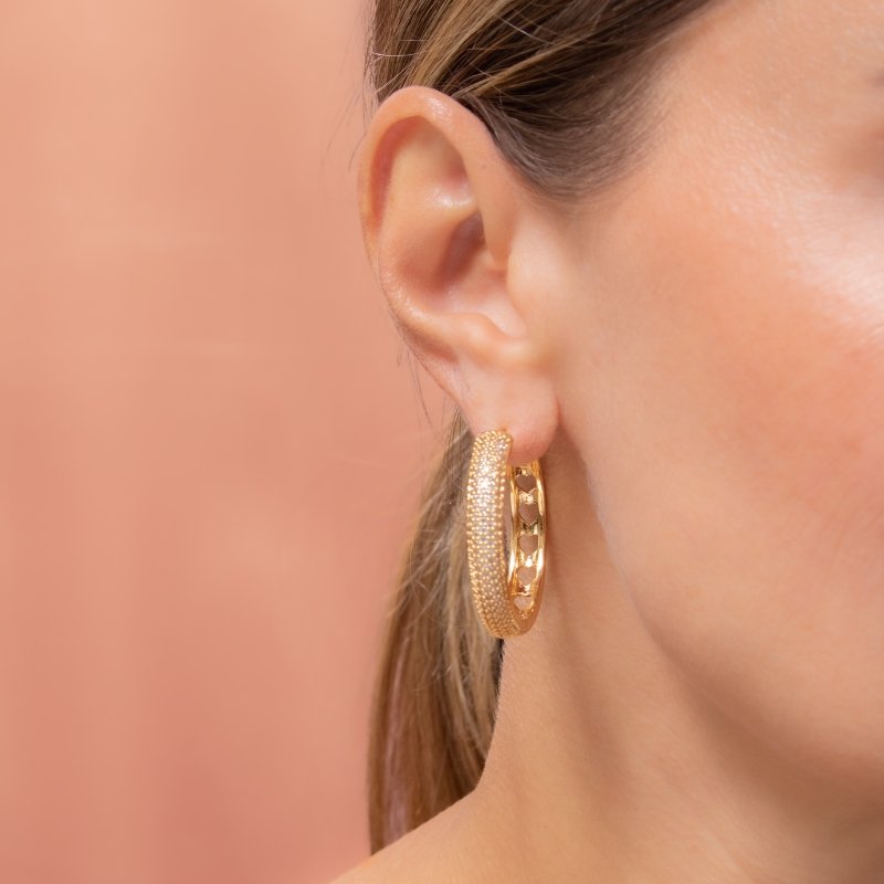 Brinco argola 30mm cravejada, brilho marcante em um clássico que nunca sai de moda.Brincos e piercing fake: 5 milésimos de Ouro 18k.