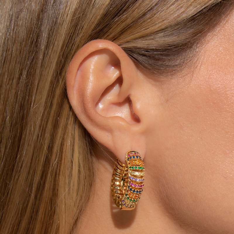 \"Brinco argola espiral com zircônias, um toque moderno e brilhante para um visual sofisticado e cheio de estilo.\"Brincos e piercing fake: 5 milésimos de Ouro 18k.