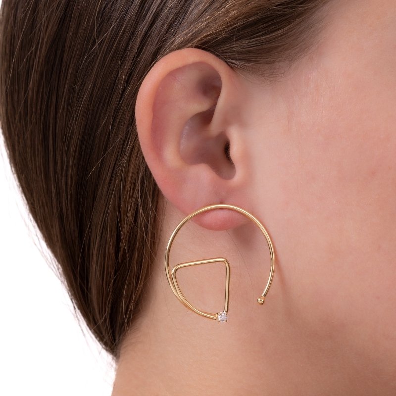 Brinco argola com triângulo e uma zircônia, design geométrico com toque de brilho e modernidade.Brincos e piercing fake: 5 milésimos de Ouro 18k.