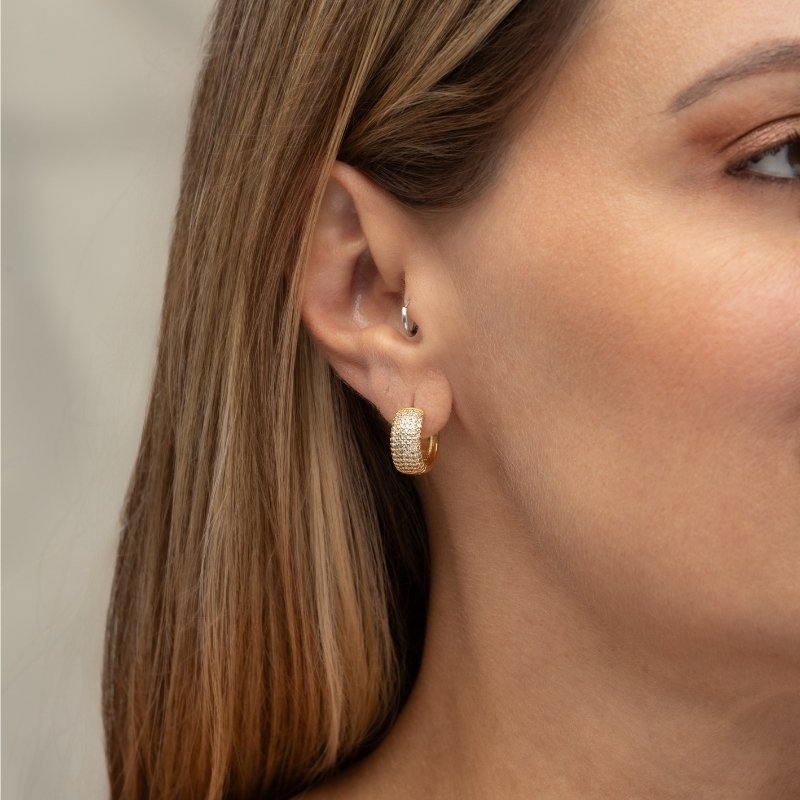 Brinco argola cravejada 14mm, moderno e elegante, perfeito para adicionar brilho e estilo ao seu look.Brincos e piercing fake: 5 milésimos de Ouro 18k.