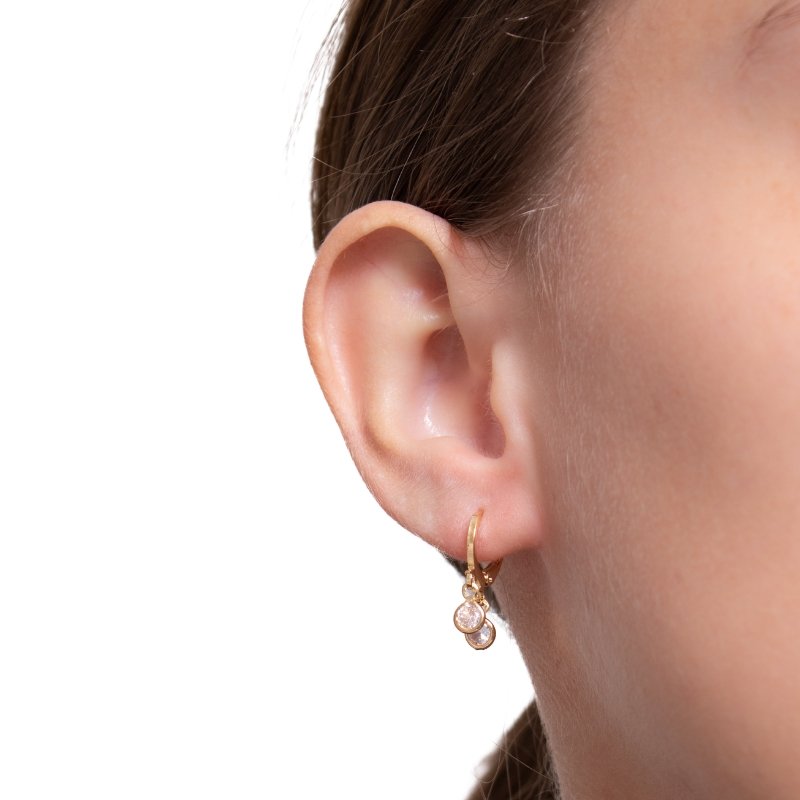 Brinco articulado com duas zircônias, perfeito para destacar elegância com brilho e movimento.Brincos e piercing fake: 5 milésimos de Ouro 18k.