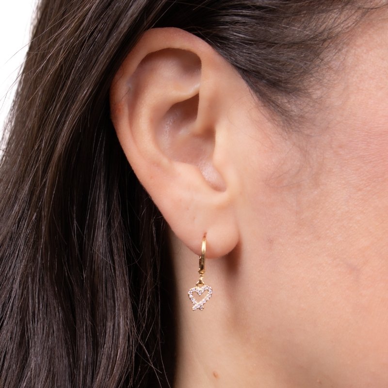 Brinco articulado Coração vazado em zircônias: leveza e romantismo com brilho delicado.Brincos e piercing fake: 5 milésimos de Ouro 18k.