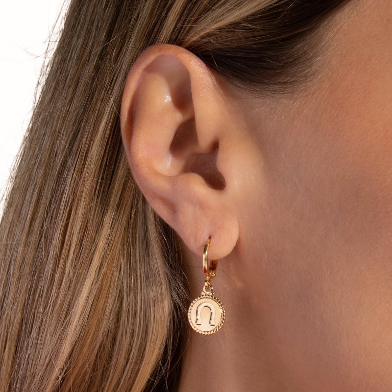 Brinco articulado medalha ferradura, semijoia elegante e charmosa, perfeita para compor looksBrincos e piercing fake: 5 milésimos de Ouro 18k.