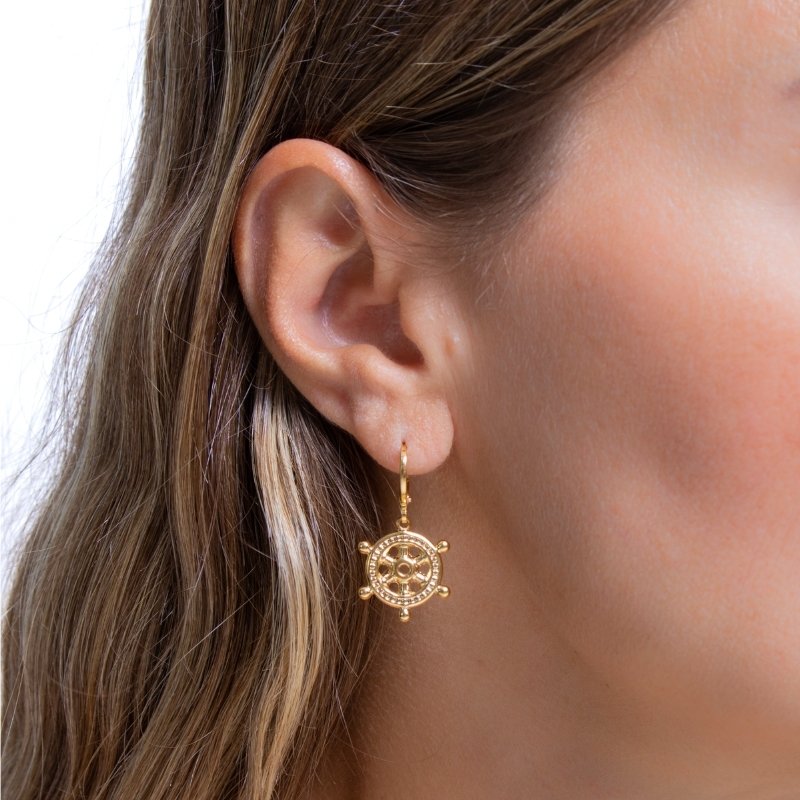 Brinco Articulado Roda do Leme: design sofisticado e moderno, perfeito para complementar looks elegantes com um toque de charme.Brincos e piercing fake: 5 milésimos de Ouro 18k.
