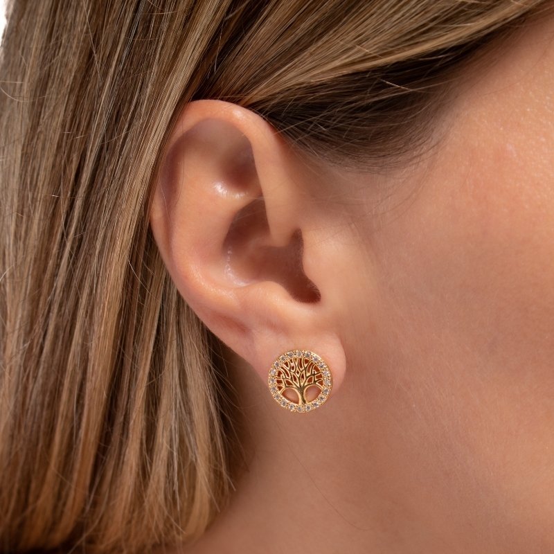 Brinco Árvore da Vida 12mm com zircônias em volta, simbolismo e elegância em cada detalhe.Brincos e piercing fake: 5 milésimos de Ouro 18k.
