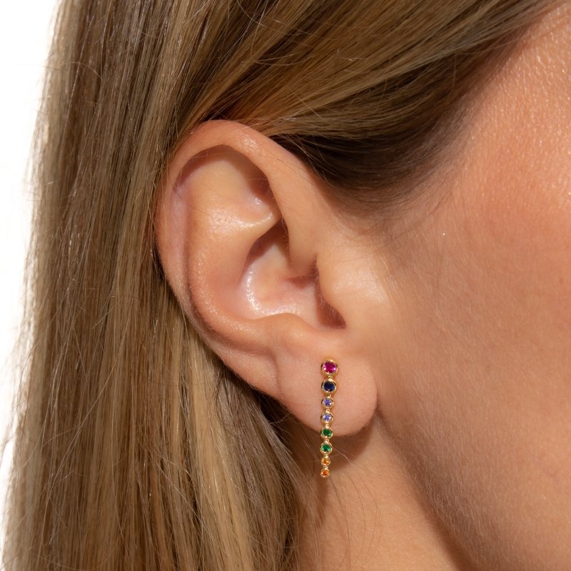 Brinco com 8 zircônias redondas coloridas, uma opção vibrante e cheia de brilho para destacar seu estilo.Brincos e piercing fake: 5 milésimos de Ouro 18k.