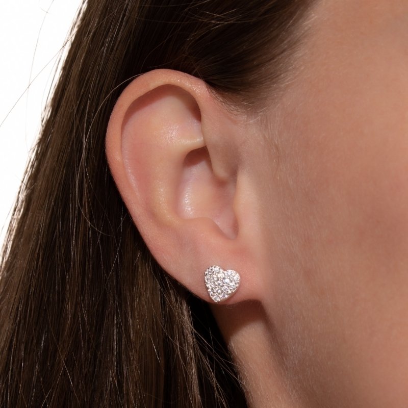 Brinco Coração 8mm cravejado em Prata 925, brilho romântico para destacar seu estilo.Peças em PRATA 925.