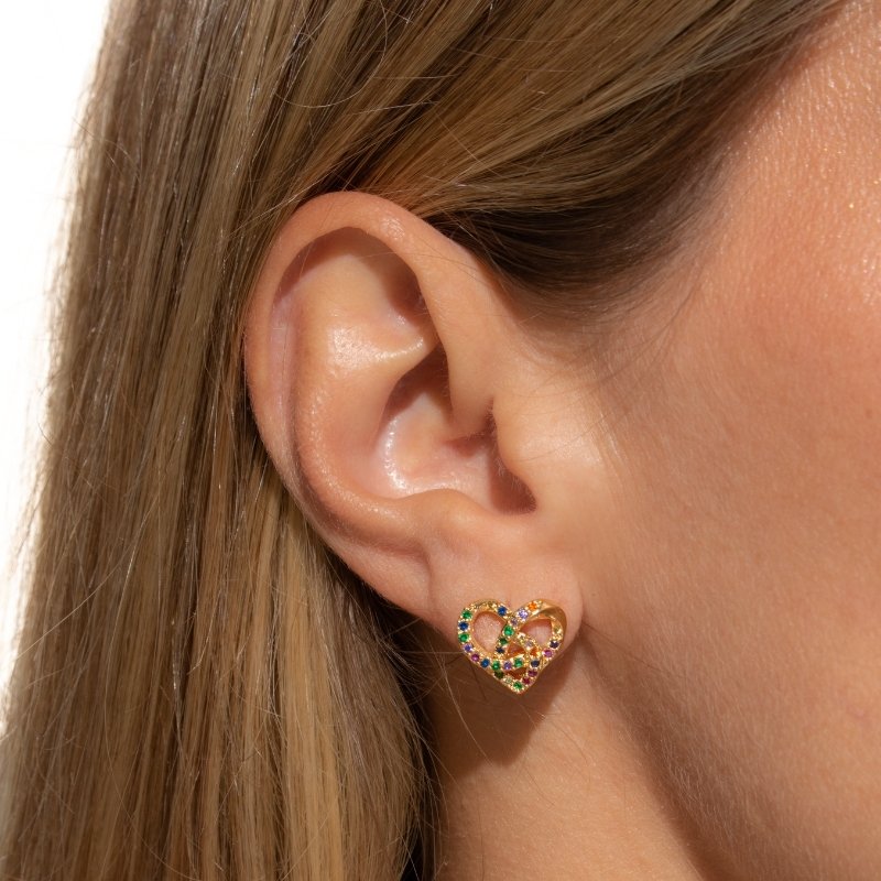 Brinco Coração Trançado com Zircônias Color: um design romântico e elegante, com zircônias coloridas que adicionam brilho e sofisticação ao seu look.Brincos e piercing fake: 5 milésimos de Ouro 18k.