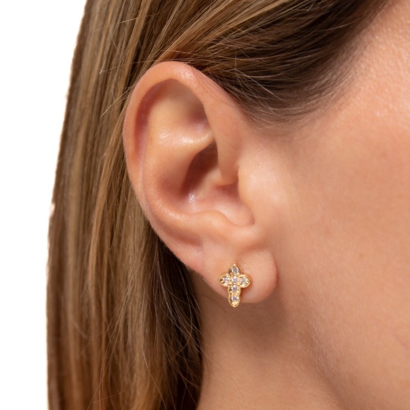 Brinco Cruz 10mm com zircônias: símbolo de fé com toque de brilho e sofisticação.Brincos e piercing fake: 5 milésimos de Ouro 18k.