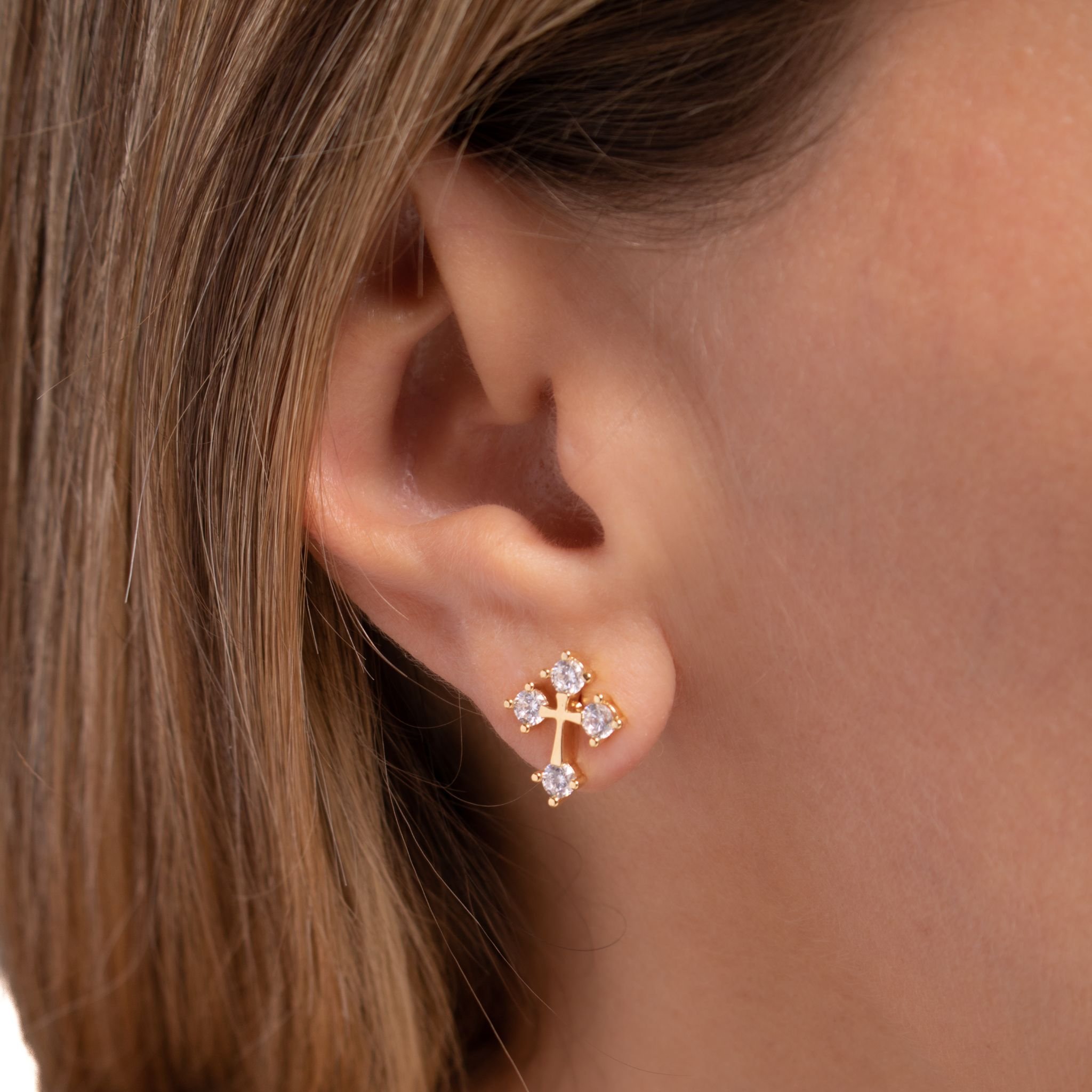 Brinco Cruz com 4 zircônias 13mm: elegância e espiritualidade em um design luminoso.Brincos e piercing fake: 5 milésimos de Ouro 18k.