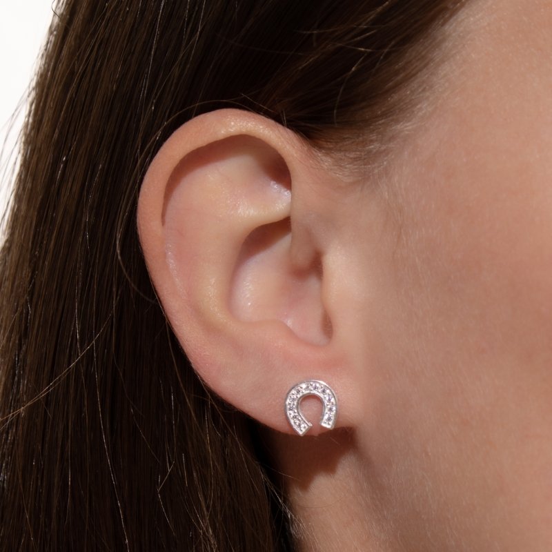 Brinco Ferradura Cravejado em Prata 925, símbolo de sorte com brilho sofisticado.Peças em PRATA 925.