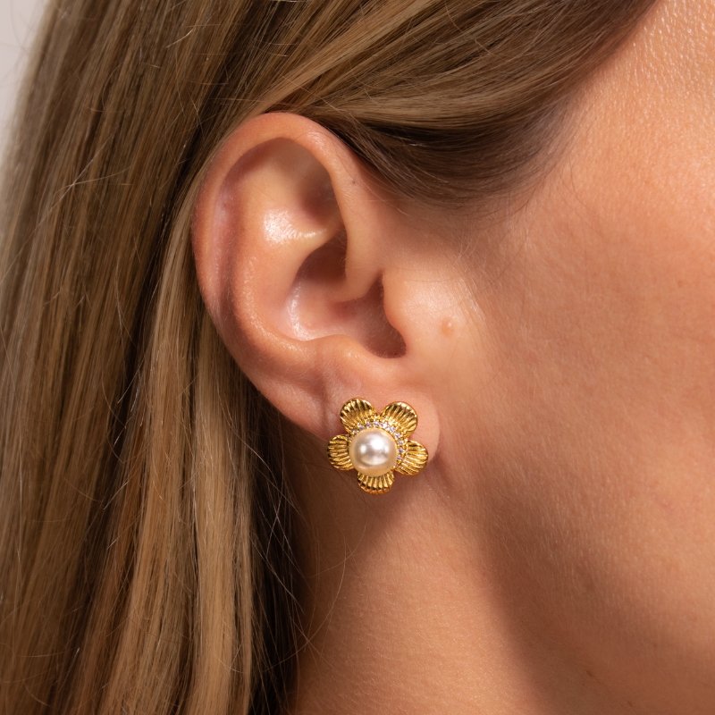 Brinco flor com 5 pétalas e pérola de 8mm, uma peça delicada e sofisticada para complementar seu look.Brincos e piercing fake: 5 milésimos de Ouro 18k.