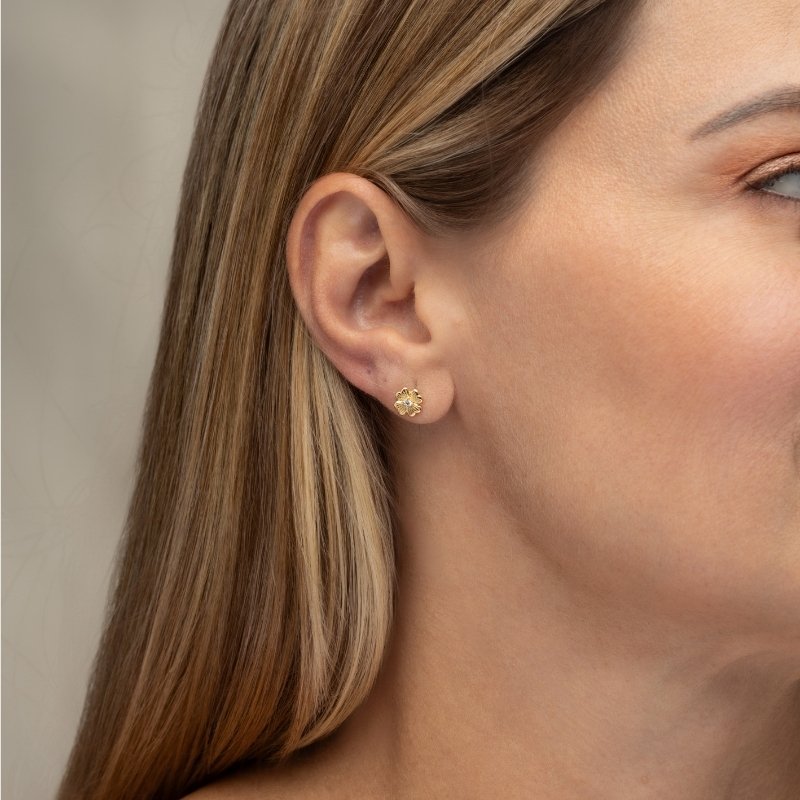 Brinco flor com 1 zircônia, delicado e sofisticado, ideal para quem busca um toque de brilho sutil e charme.Brincos e piercing fake: 5 milésimos de Ouro 18k.