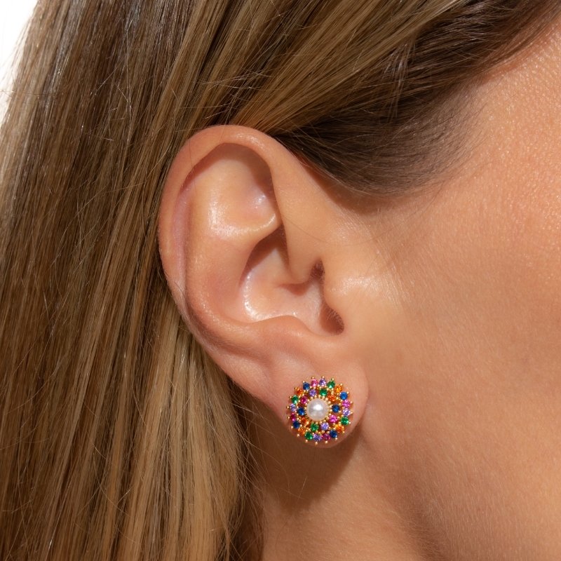 Brinco Flor com Pérola 4mm Cravejada Color: delicadeza e charme em um design floral, com pérolas e zircônias coloridas para um toque único de elegância.Brincos e piercing fake: 5 milésimos de Ouro 18k.