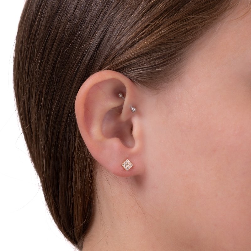 Brinco losango cravejado, destaque e elegância em um design clássico e brilhante.Brincos e piercing fake: 5 milésimos de Ouro 18k.