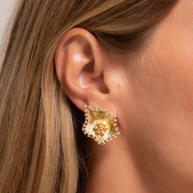 \"Brinco orgânico de 21mm com zircônias, combinando design sofisticado e brilho refinado para um estilo único.\"Brincos e piercing fake: 5 milésimos de Ouro 18k.