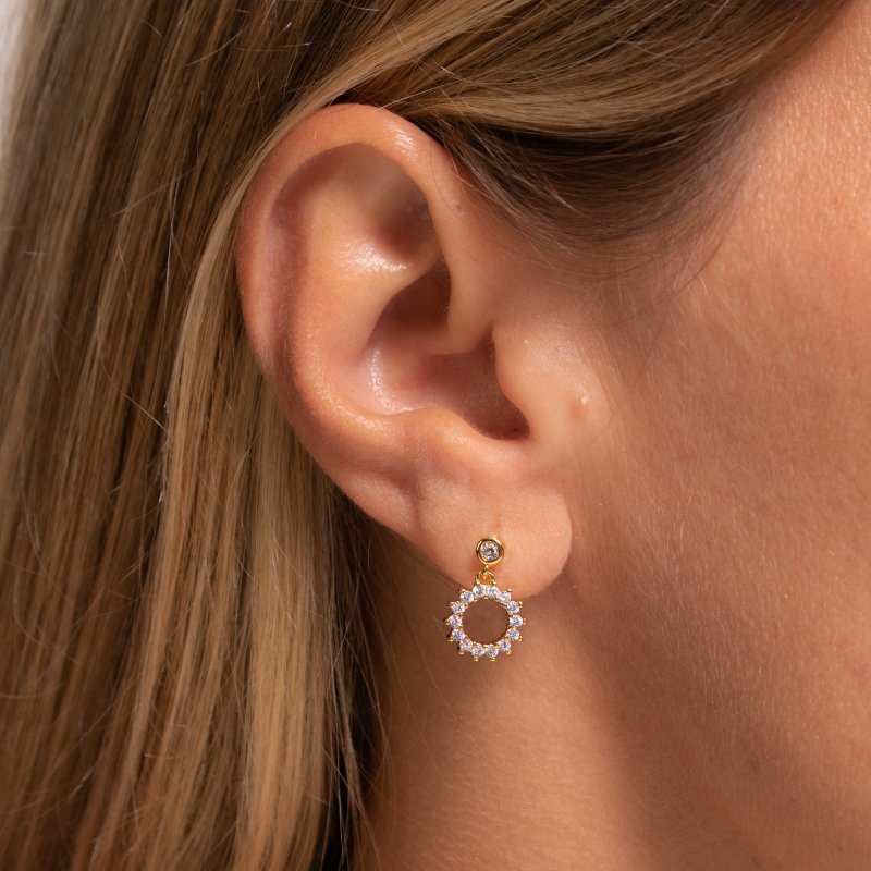 Brinco Pêndulo Rendondo Cravejado: sofisticação e glamour em uma peça delicada, ideal para iluminar qualquer look.Brincos e piercing fake: 5 milésimos de Ouro 18k.