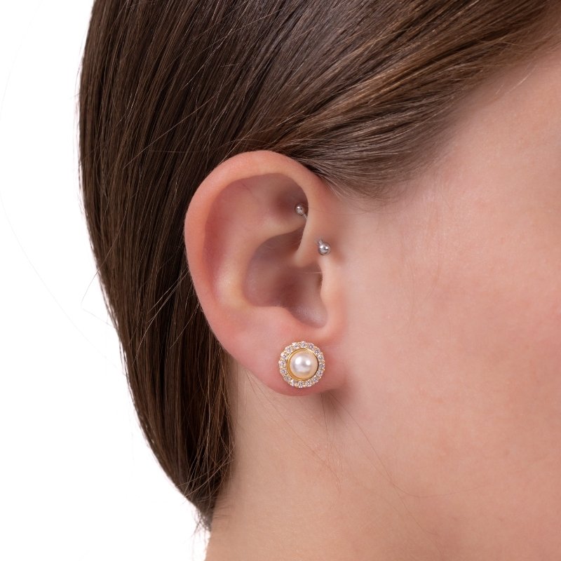 Brinco redondo cravejado com pérola de 6mm, combinação perfeita de brilho e delicadeza.Brincos e piercing fake: 5 milésimos de Ouro 18k.