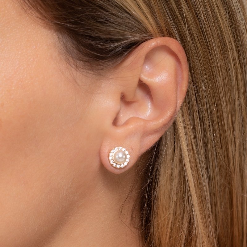 Brinco redondo cravejado com pérola de 6mm, um toque de elegância e sofisticação que combina o brilho das zircônias com a delicadeza da pérola.Brincos e piercing fake: 5 milésimos de Ouro 18k.