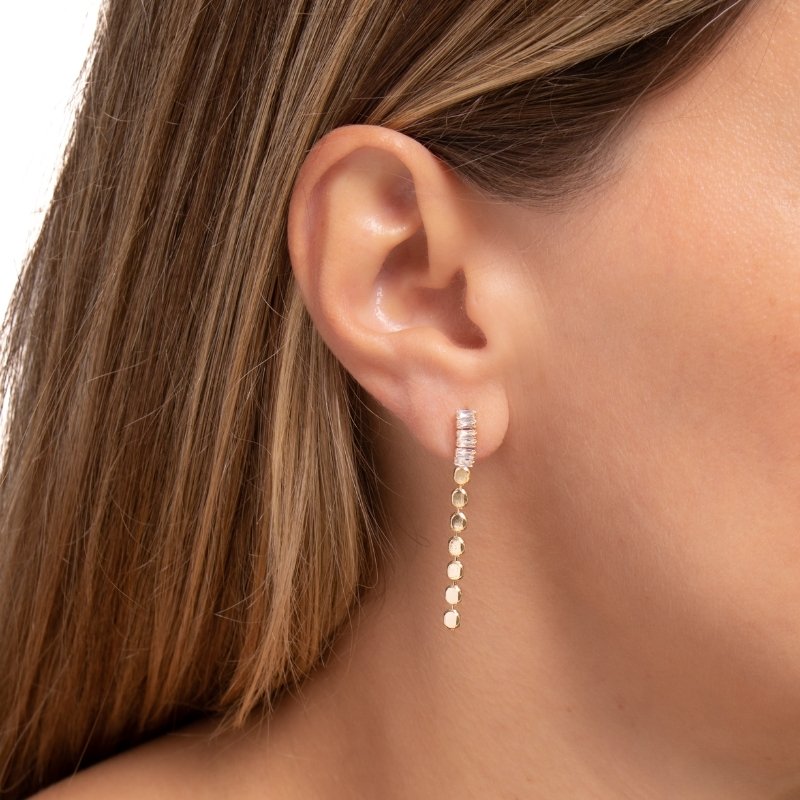 Brinco Riviera Baguete com Bolinhas Pêndulas: charme contemporâneo com brilho e movimento na medida certa.Brincos e piercing fake: 5 milésimos de Ouro 18k.