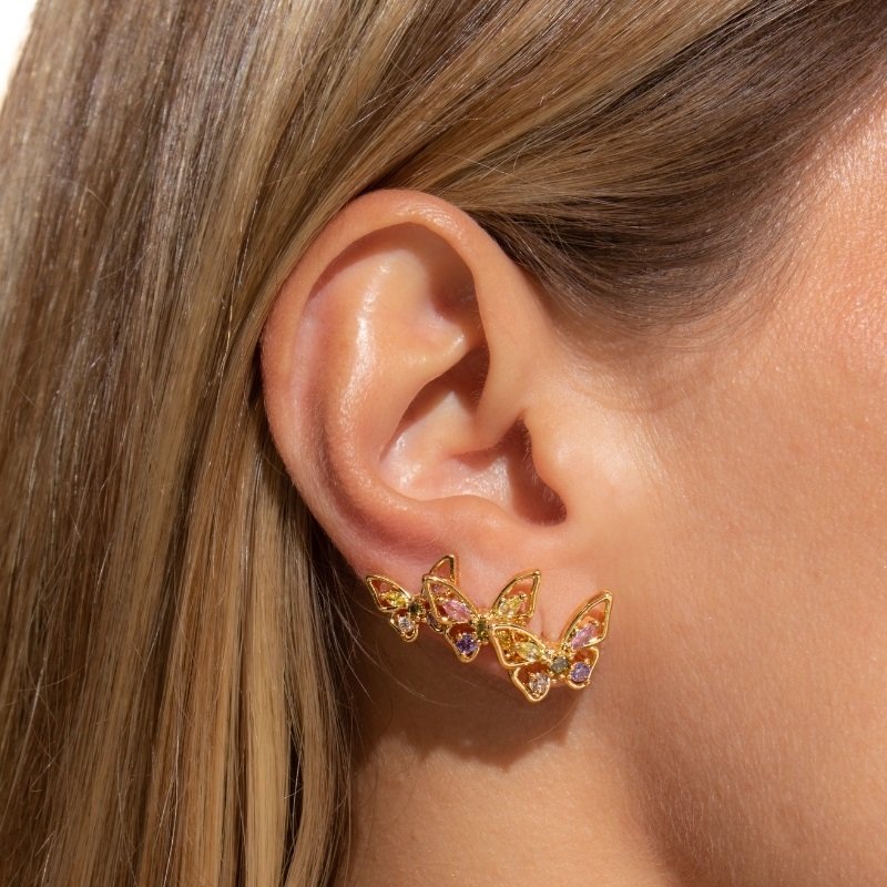 \"Brinco Trio Borboleta com Zircônias Coloridas, sofisticação e delicadeza para iluminar seu estilo.\"Brincos e piercing fake: 5 milésimos de Ouro 18k.