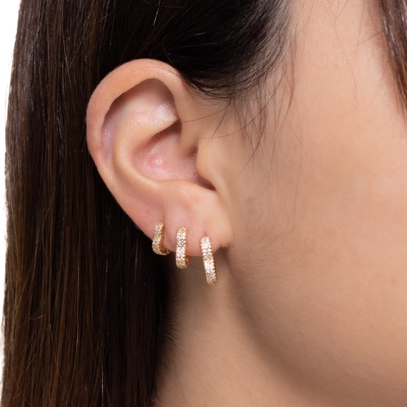 Brinco trio coração com duas fileiras de zircônias, um toque de romantismo e brilho para um visual encantador.Brincos e piercing fake: 5 milésimos de Ouro 18k.