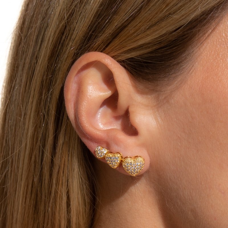 Brinco Trio Coração com Zircônia: um design romântico e sofisticado, com brilho intenso para realçar sua beleza com estilo.Brincos e piercing fake: 5 milésimos de Ouro 18k.