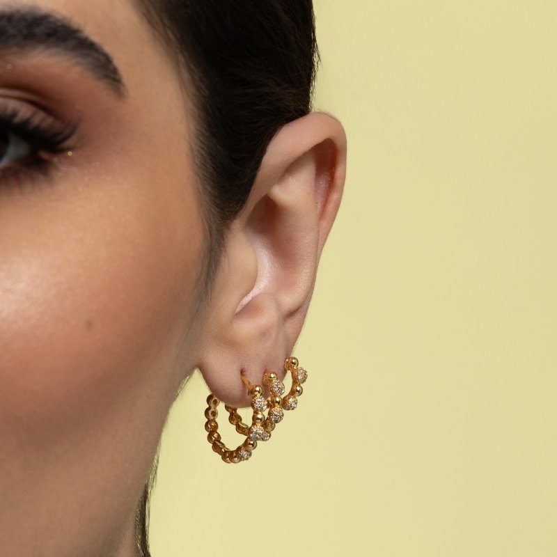 Brinco Trio em Bolinhas com Flor em Zircônia: um detalhe floral encantador com um brilho sutil e elegante.Brincos e piercing fake: 5 milésimos de Ouro 18k.