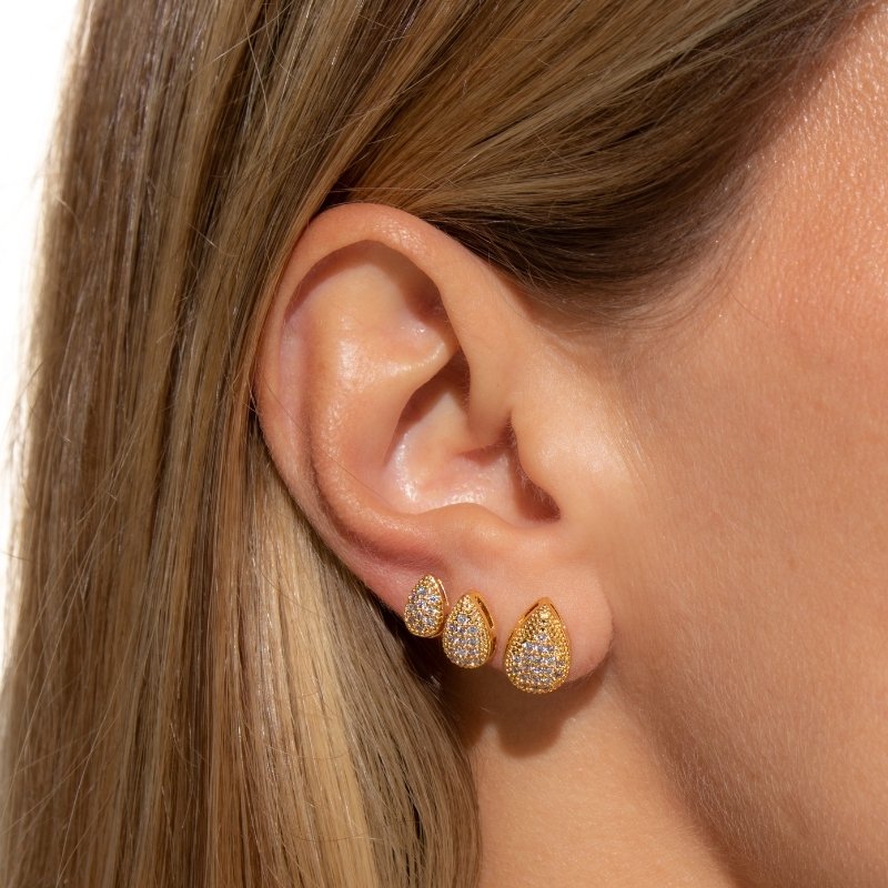 Brinco Trio Gota Cravejada: um design elegante e moderno, com o brilho delicado das zircônias para um visual sofisticado.Brincos e piercing fake: 5 milésimos de Ouro 18k.
