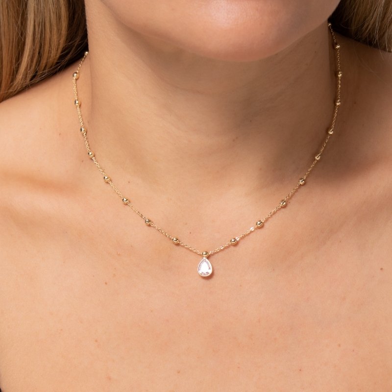 Colar bolinha 40/45cm com gota em zircônia 8mm: sofisticação delicada com toque de brilho único.Brincos e piercing fake: 5 milésimos de Ouro 18k.
