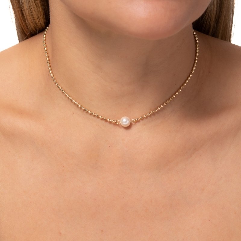 Colar bolinha com pérola de 11mm, clássico e elegante, ideal para compor looks sofisticados com delicadeza.Brincos e piercing fake: 5 milésimos de Ouro 18k.