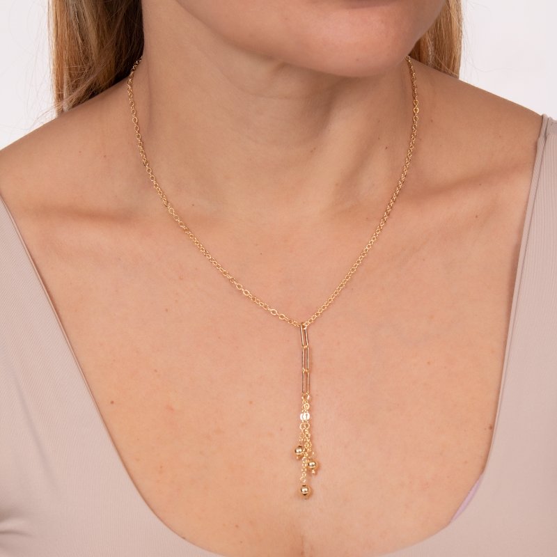Colar Cadeadinho com 3 Bolinhas Pêndulas, toque leve e elegante para complementar seu estilo.Brincos e piercing fake: 5 milésimos de Ouro 18k.