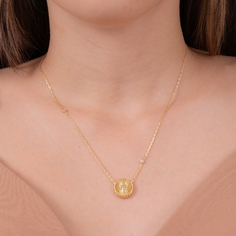 Colar cadeadinho com medalha de cruz 15mm, estilo moderno com toque de fé e atitude.Brincos e piercing fake: 5 milésimos de Ouro 18k.