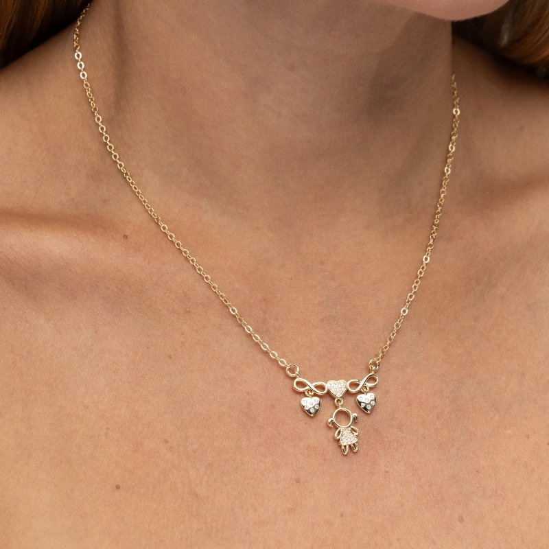 \"Colar Cadeadinho com Pingente Infinito e 3 Corações Menina, uma peça delicada e cheia de significado, perfeita para simbolizar amor e eternidade com sofisticação.\"Brincos e piercing fake: 5 milésimos de Ouro 18k.